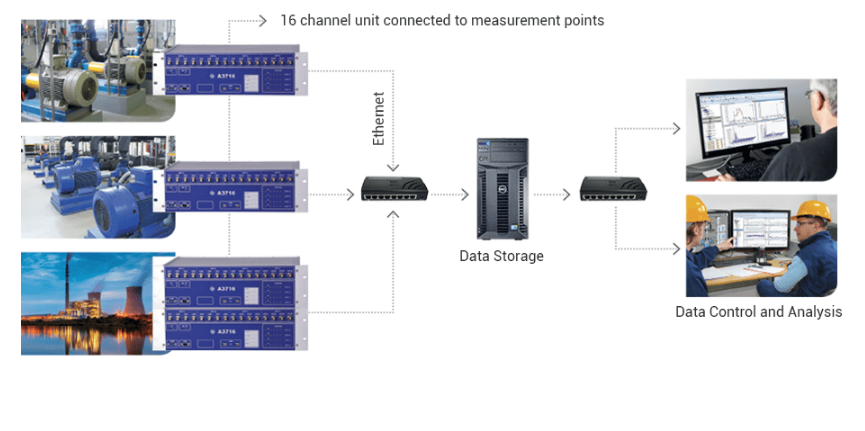 Monitor your critical machinery 24/7 with high-end A3716 online monitoring system. A3716 contains 16 AC channels for vibration measurements and 16 DC channels for process values such as temperature, pressure etc. All channels are measured fully simultaneously. 4 tacho / speed channels are included. Beside trending of vibration values you can measure more advanced measurements like Orbits, Centerline, SMax and more.